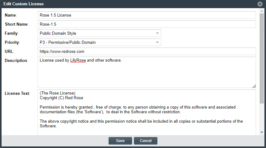 1. From the Edit Custom License window, update the license properties as needed. For property descriptions, see Custom License Properties.